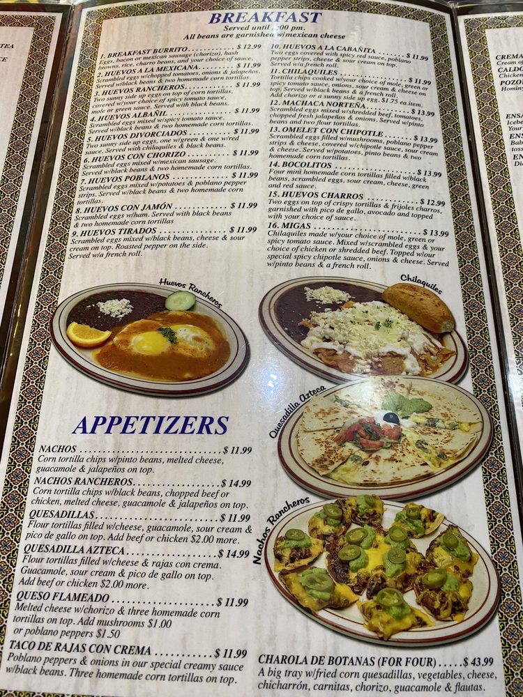 Scrambled eggs filled with mushrooms, poblano pepper strips and cheese, covered with chipotle sauce, sour cream and cheese. Served with potatoes, pinto beans and two homemade corn tortillas